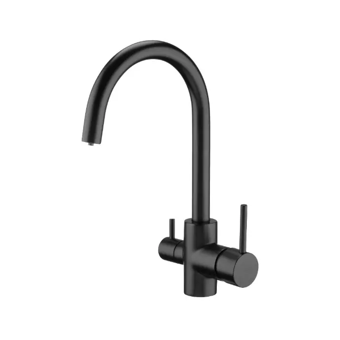This three-way faucet features a stainless steel body with a durable, easy-to-clean Nero coating and a stream aerator for efficient flow. It includes a 1/4" quick connector for water filter hoses, 45 cm brass-ended hoses, and a mounting sleeve for easy setup. Lab-tested materials ensure reliability.