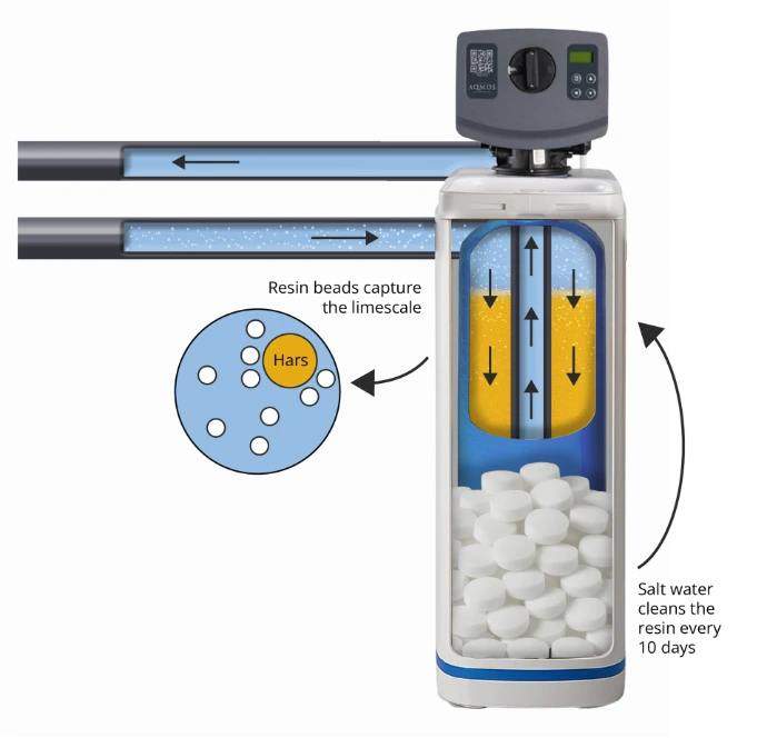 When the resin reaches its maximum capacity, the system automatically regenerates it with salt water. Sodium binds to the resin and releases the limescale, which is then flushed away. After a final rinse with clean water, the softener is ready to deliver soft water again.